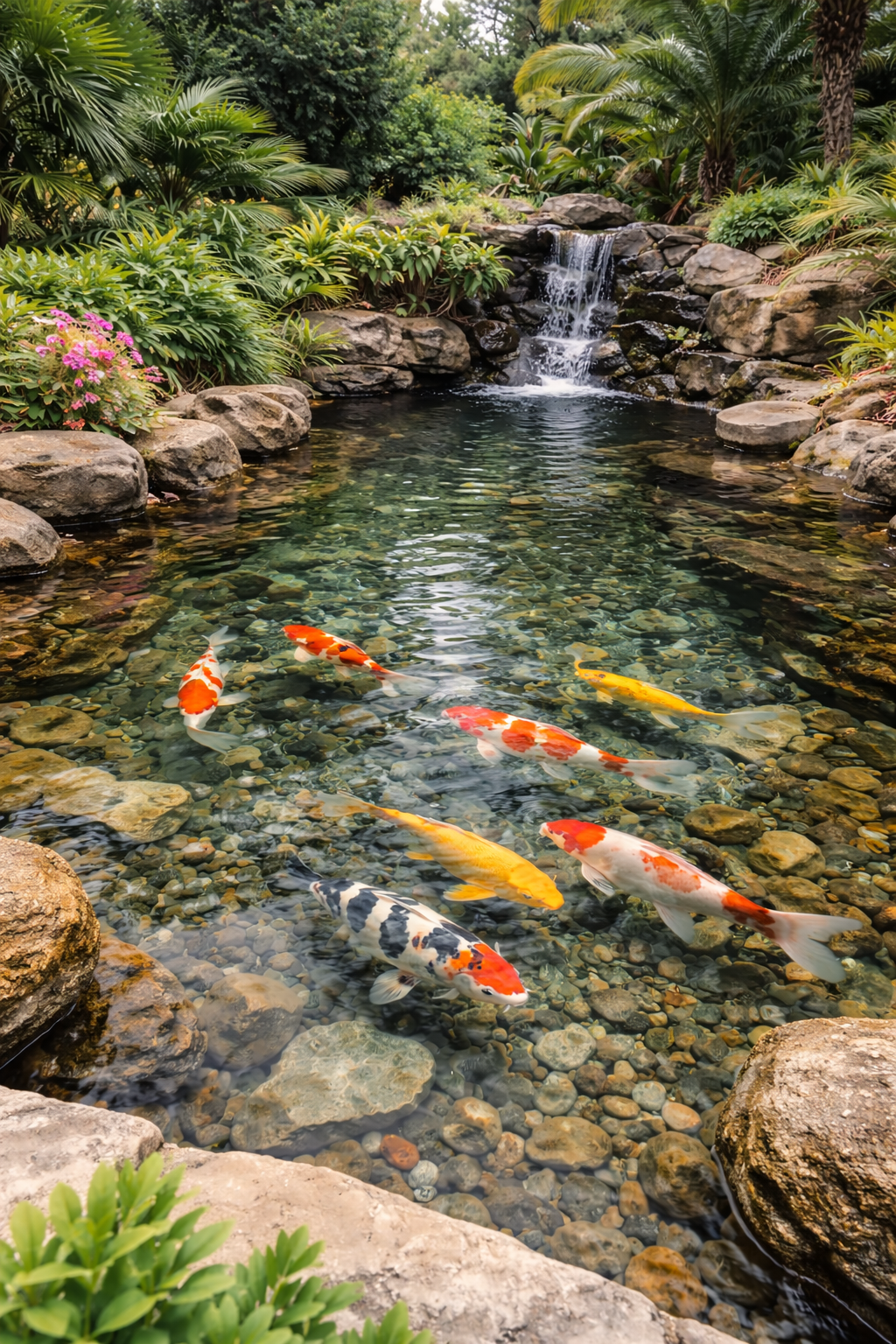 Atendemos residências, condomínios e espaços comerciais oferecendo manutenção preventiva e corretiva, além de fornecimento de carpas koi selecionadas e equipamentos profissionais para lagos ornamentais e Rações